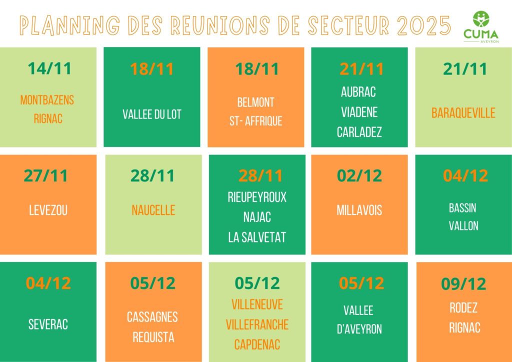 Les Présidents, Trésoriers et Secrétaires de CUMA recevront une convocation une dizaine de jours avant la date de la réunion (voir planning ci-dessous), qui précisera le lieu et les horaires (en matinée). A charge à eux d’inviter d’autres administrateurs de leur CUMA.